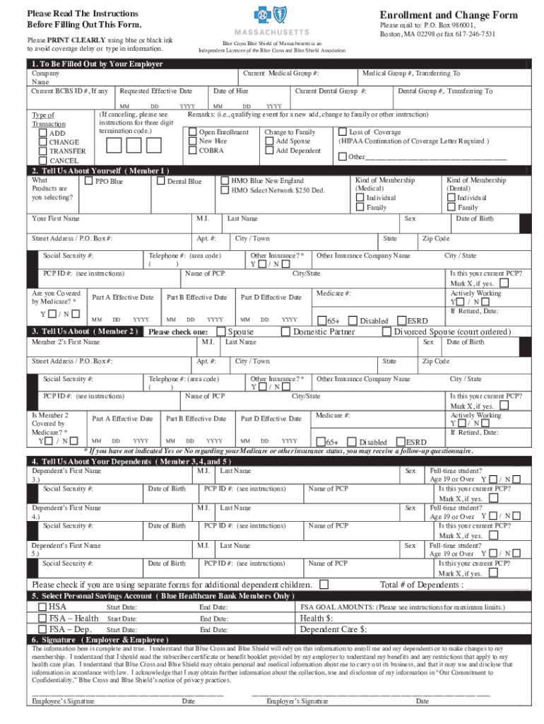 Please, Read The Instructions Before Filling Out This Form. Enrollment and Change Form Please mail to: P.O. Box 986001, Boston, MA 02298 or fax 6172467531Please PRINT CLEARLY using blue or black ink