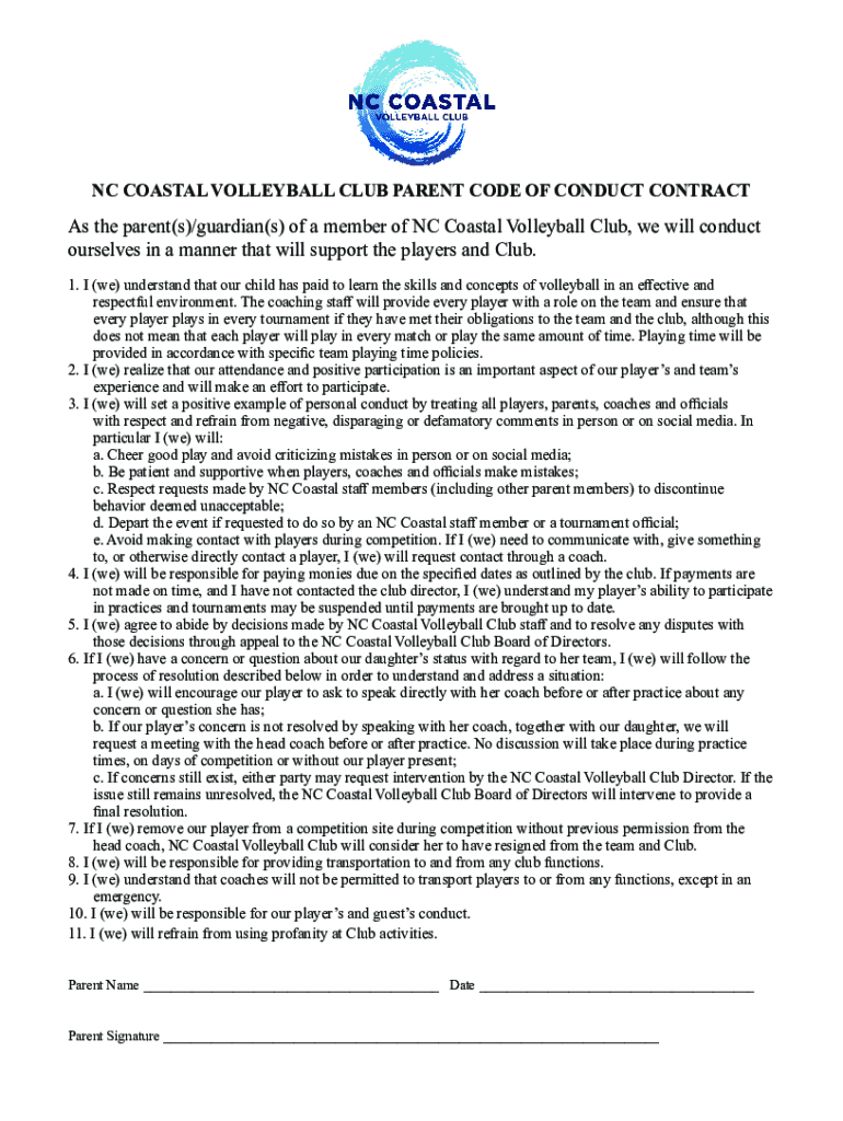 Get the free NC COASTAL VOLLEYBALL CLUB PARENT CODE OF CONDUCT CONTRACT