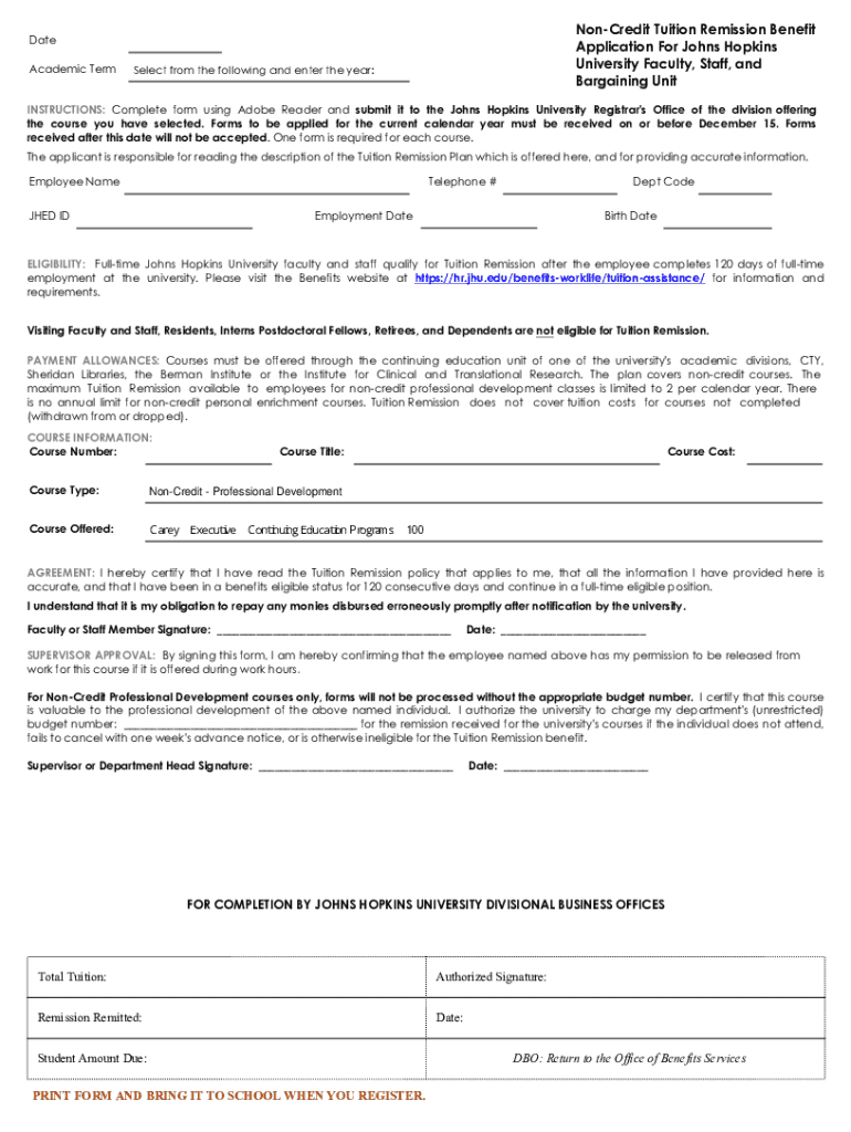 Noncredit Tuition Remission Benefit Application For Johns Hopkins University Faculty, Staff, and Bargaining Initiate Academic Term Select from the following and enter the year:INSTRUCTIONS: Complete