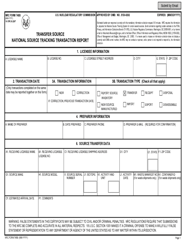 Submit by Email U.S. NUCLEAR REGULATORY COMMISSION APPROVED BY OMB: NO. 31500202NRC FORM 748B (MAYDAY) 10 CFR 20.2207TRANSFER SOURCE NATIONAL SOURCE TRACKING TRANSACTION REPORTEXPIRES: (MM/DD/YYY)Estimated