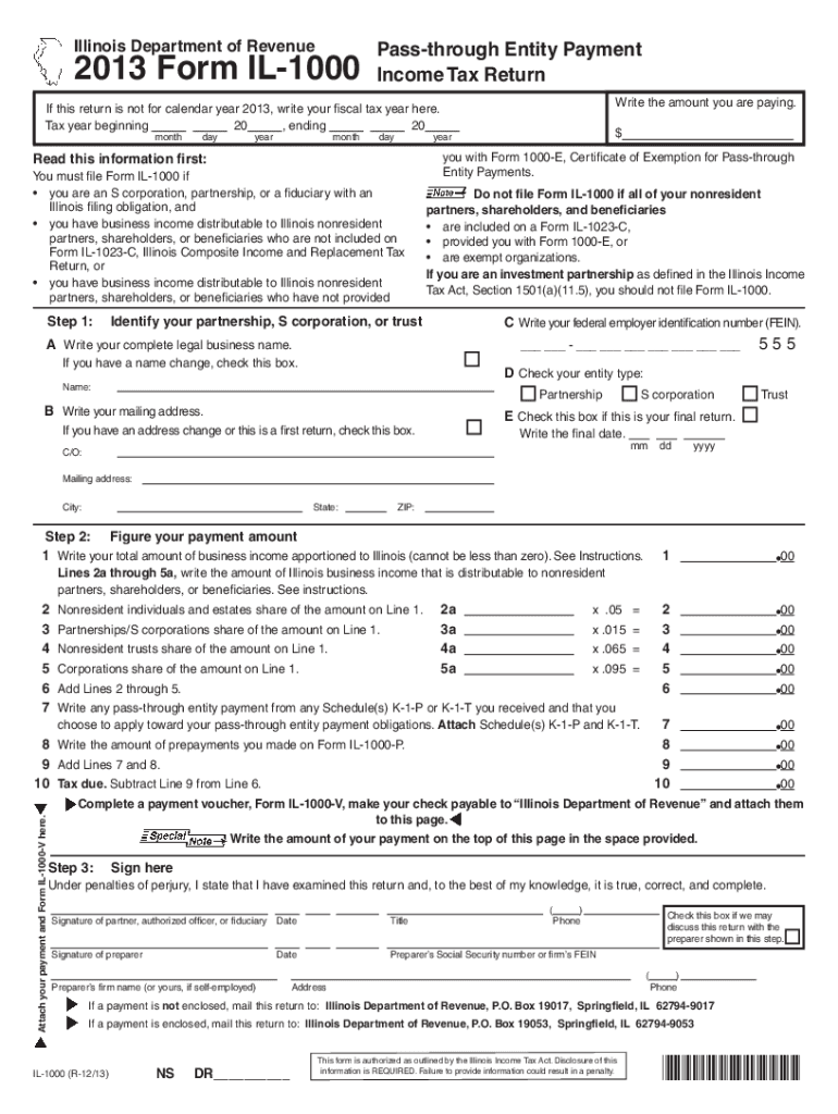 Use your mouse or Tab key to move through the fields. Use your mouse or space bar to enable check boxes. Illinois Department of RevenuePassthrough Entity Payment2013 Form IL1000Income Tax ReturnWrite