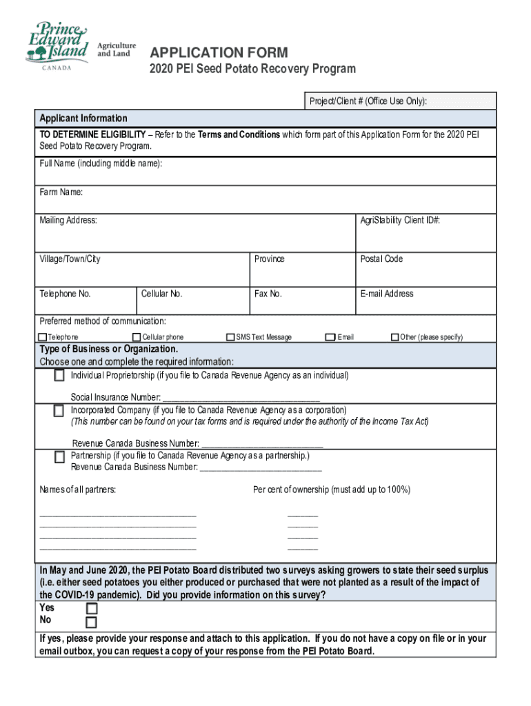 APPLICATION FORM 2020 PEI Seed Potato Recovery Program Project/Client # (Office Use Only):Applicant Information TO DETERMINE ELIGIBILITY Refer to the Terms and Conditions which form part of this Application