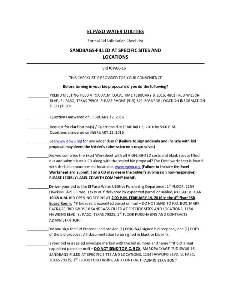 EL PASO WATER UTILITIES Formal Bid Solicitation Check ListSANDBAGSFILLED AT SPECIFIC SITES AND LOCATIONS Bid #SW0616 THIS CHECKLIST IS PROVIDED FOR YOUR CONVENIENCE Before turning in your bid proposal