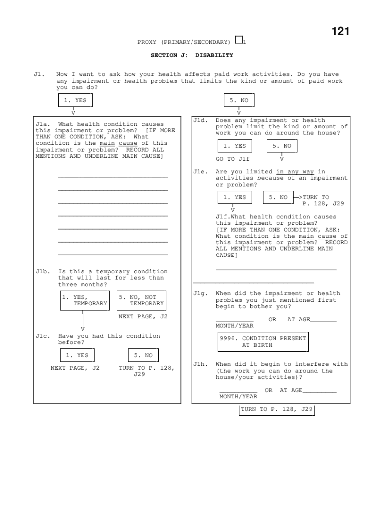 121 PROXY (PRIMARY/SECONDARY) SECTION J:1DISABILITYJ1. Now I want to ask how your health affects paid work activities. Do you have any impairment or health problem that limits the kind or amount of