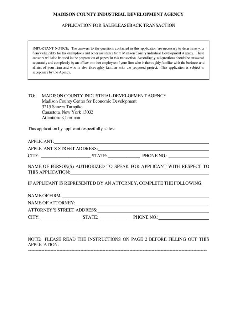 MADISON COUNTY INDUSTRIAL DEVELOPMENT AGENCY APPLICATION FOR SALE/LEASEBACK TRANSACTIONIMPORTANT NOTICE: The answers to the questions contained in this application are necessary to determine your