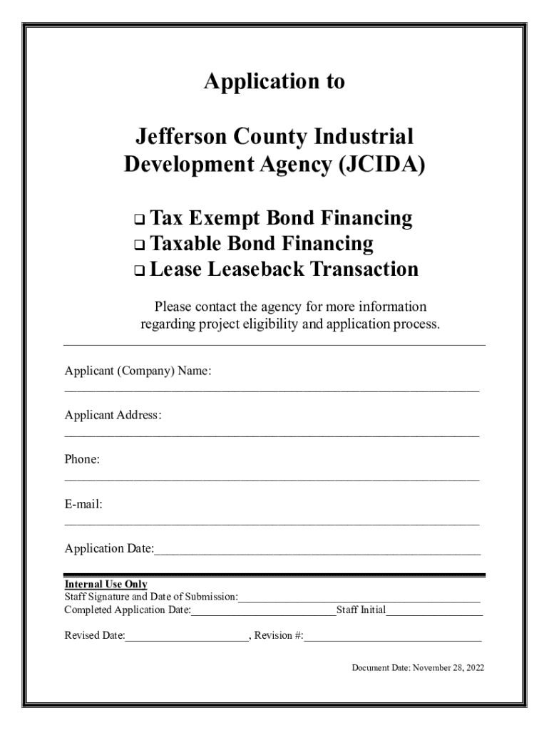 Application to Jefferson County Industrial Development Agency (ACID) Tax-exempt Bond Financing Taxable Bond Financing Lease Leaseback Transaction Please contact the agency for more information regarding