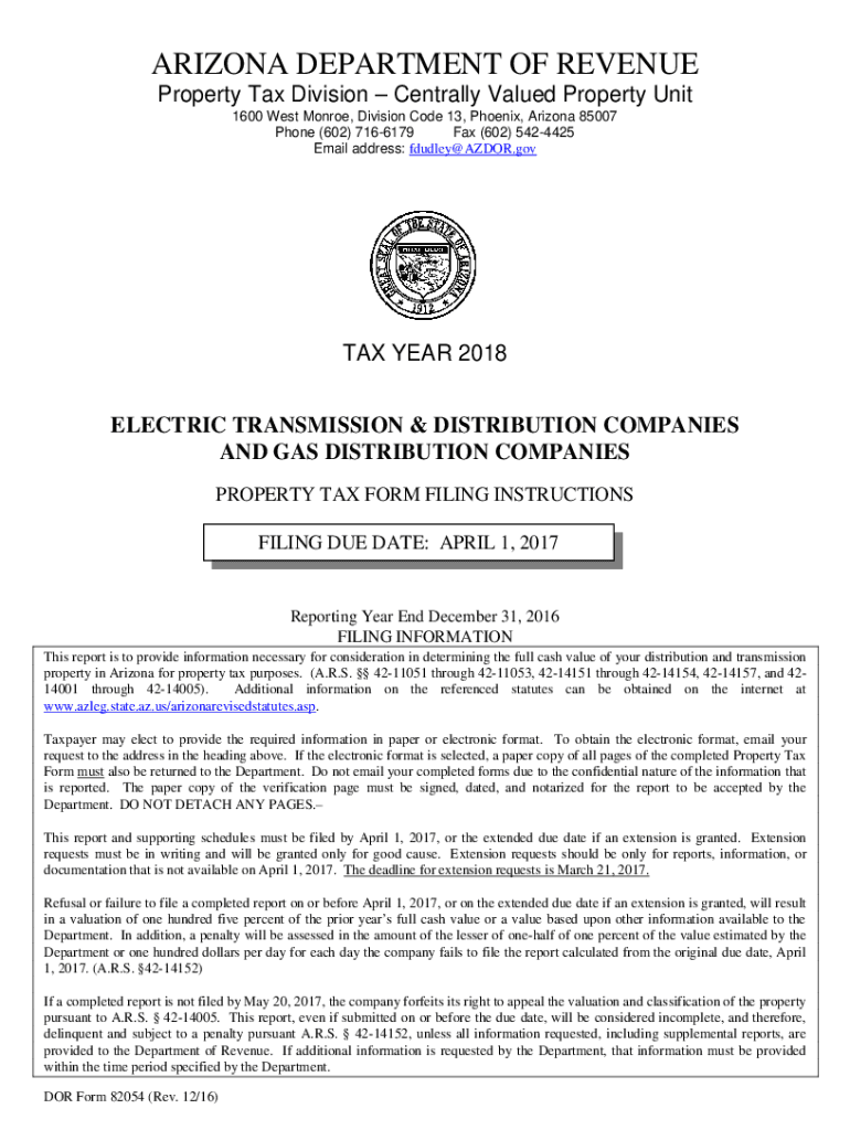 ARIZONA DEPARTMENT OF REVENUE Property Tax Division Centrally Valued Property Unit 1600 West Monroe, Division Code 13, Phoenix, Arizona 85007 Phone (602) 7166179 Fax (602) 5424425 Email address: fdudley@AZDOR.govTAX