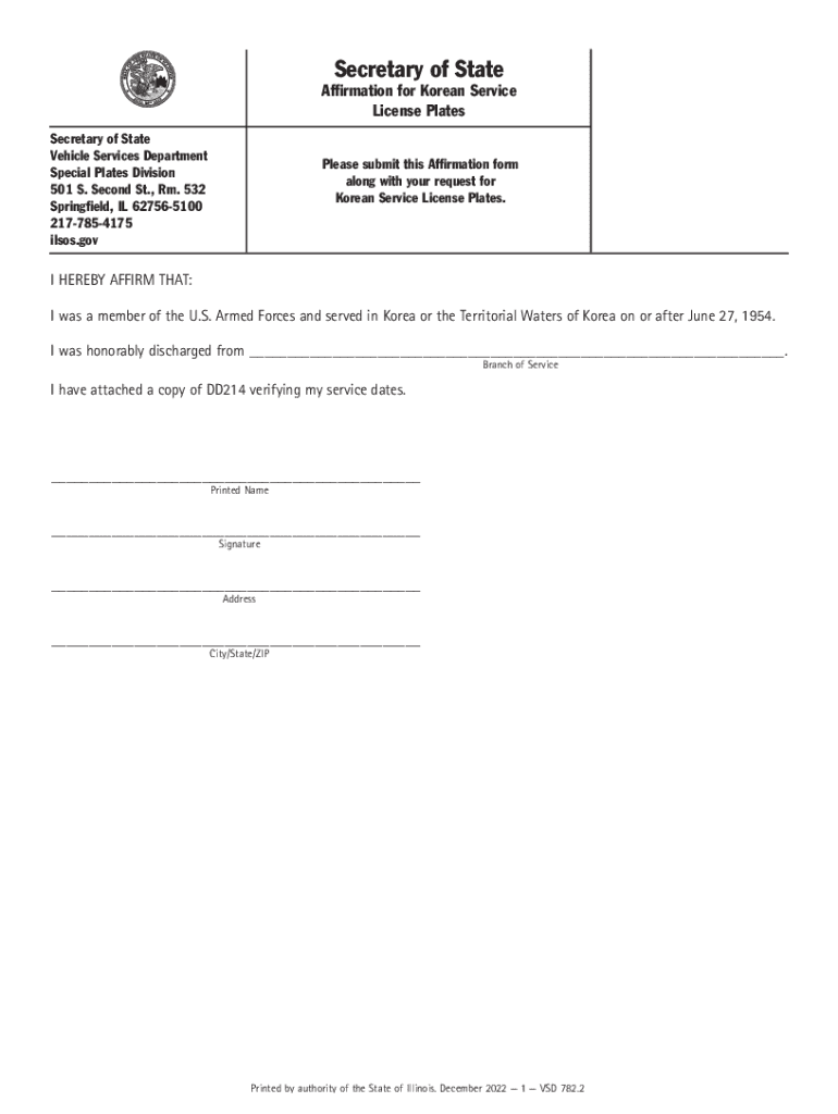 Secretary of StateResetAffirmation for Korean Service License Plates Secretary of State Vehicle Services Department Special Plates Division 501 S. Second St., Rm. 532 Springfield, IL 627565100 2177854175