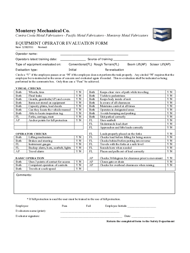 Monterey Mechanical Co. Contra Costa Metal Fabricators Pacific Metal Fabricators Monterey Metal FabricatorsEQUIPMENT OPERATOR EVALUATION FORM New: 3/28/2011Revised:Operator name:___Operators the latest