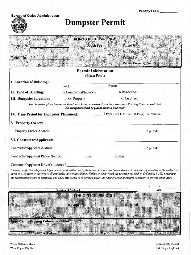 Bureau of Codes AdministrationPenalty Feet ___Dumpster PermitPermit Information (Please Print)I. Location of Building: II. Type of Building: III. Dumpster Location:(Street)(No.) O Commercial/Industrial