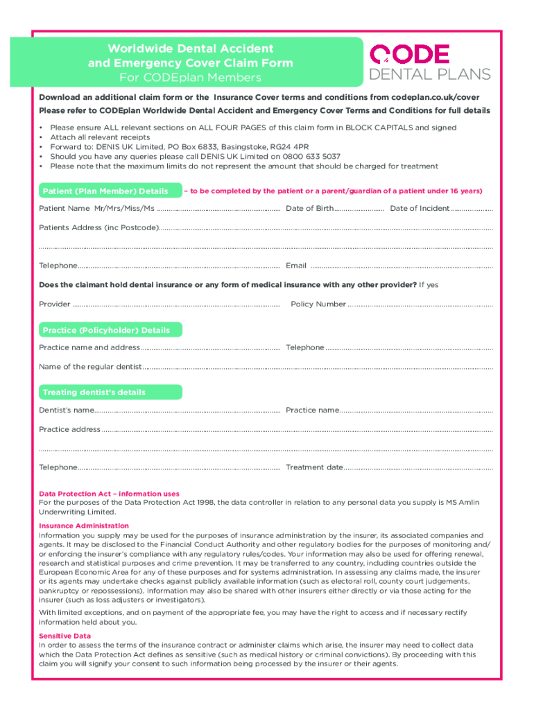 Worldwide Dental Accident and Emergency Cover Claim Form For CODE plan Members Download an additional claim form or the Insurance Cover terms and conditions from codeplan.co.uk/cover Please refer