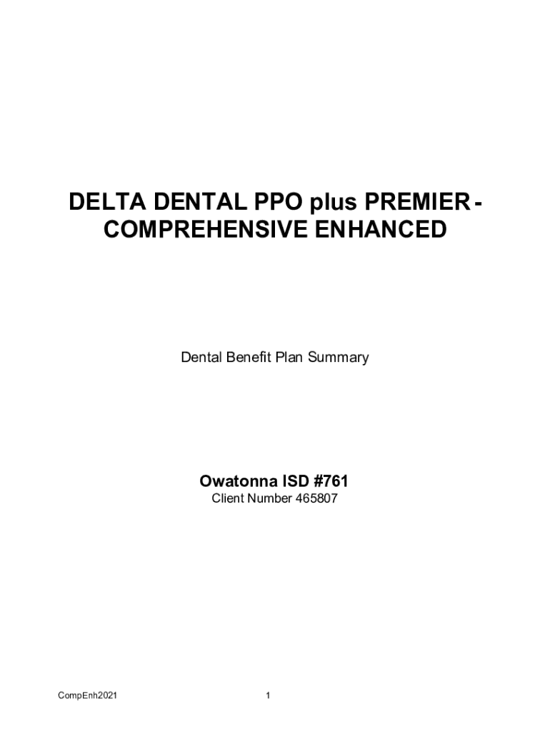 DELTA DENTAL PPO plus PREMIER COMPREHENSIVE ENHANCEDDental Benefit Plan SummaryOwatonna ISD #761 Client Number 465807CompEnh20211ADMINISTRATION The following information is provided as required by