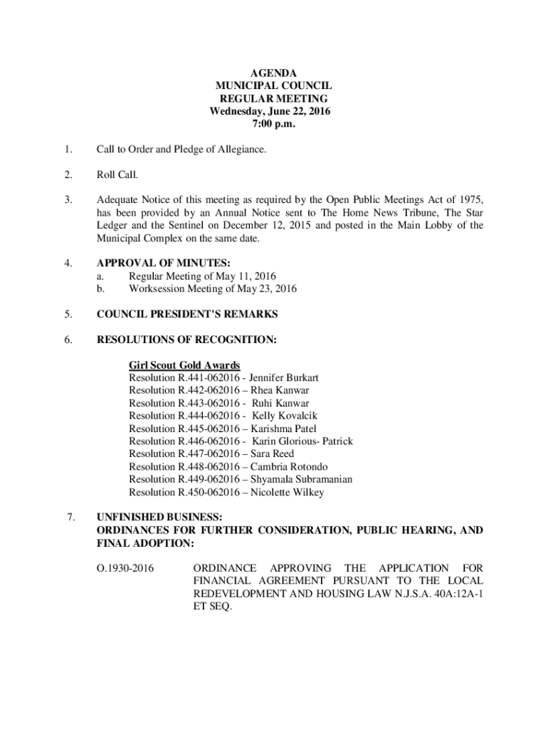 AGENDA MUNICIPAL COUNCIL REGULAR MEETING Wednesday, June 22, 2016 7:00 p.m. 1. Call to Order and Pledge of Allegiance.2. Roll Call.3. Adequate Notice of this meeting as required by the Open Public