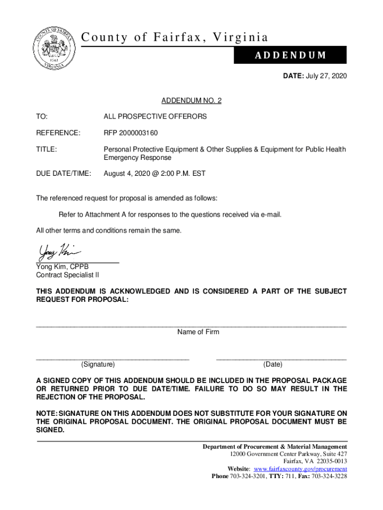 County of Fairfax, Virginia ADDENDUM DATE: July 27, 2020ADDENDUM NO. 2 TO:ALL PROSPECTIVE OFFERORSREFERENCE:RFP 2000003160TITLE:Personal Protective Equipment & Other Supplies & Equipment for Public