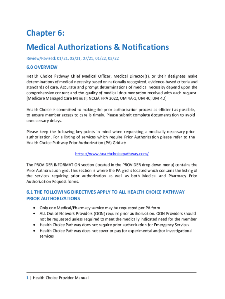 Chapter 6: Medical Authorizations & Notifications Review/Revised: 01/21, 02/21, 07/21, 01/22, 03/226.0 OVERVIEW Health Choice Pathway Chief Medical Officer, Medical Director(s), or their designees
