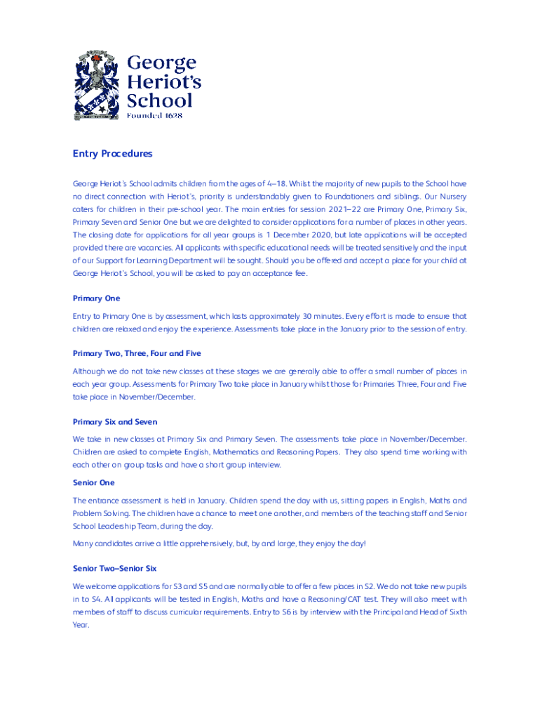 Entry Procedures George He riots School admits children from the ages of 418. Whilst the majority of new pupils to the School have no direct connection with He riots, priority is understandably given