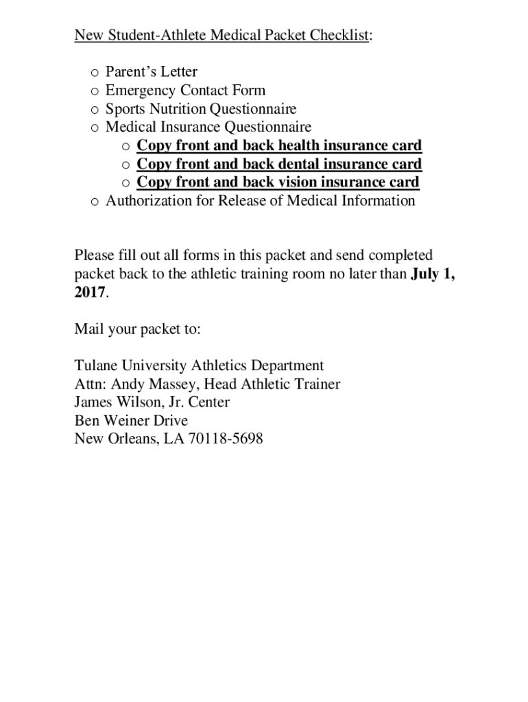 New StudentAthlete Medical Packet Checklist: Parents Letter Emergency Contact Form Sports Nutrition Questionnaire Medical Insurance Questionnaire o Copy front and back health insurance card to Copy