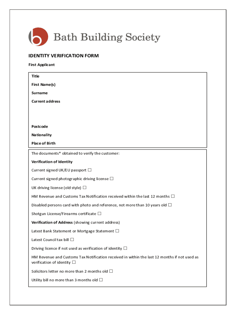 IDENTITY VERIFICATION FORM First Applicant Title First Name(s) Surname Current addressPostcode Nationality Place of Birth The documents* obtained to verify the customer: Verification of Identity Current