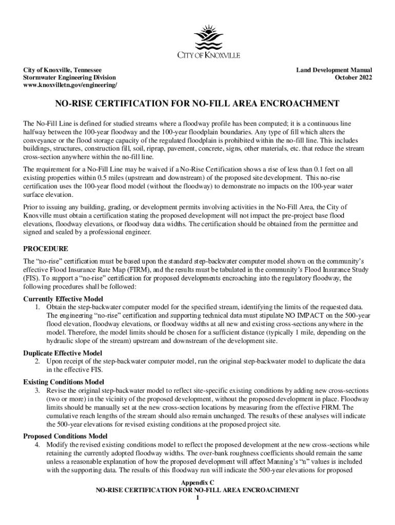 City of Knoxville, Tennessee Stormwater Engineering Division www.knoxvilletn.gov/engineering/Land Development Manual October 2022NORISE CERTIFICATION FOR FILL AREA ENCROACHMENT The Fill Line is defined
