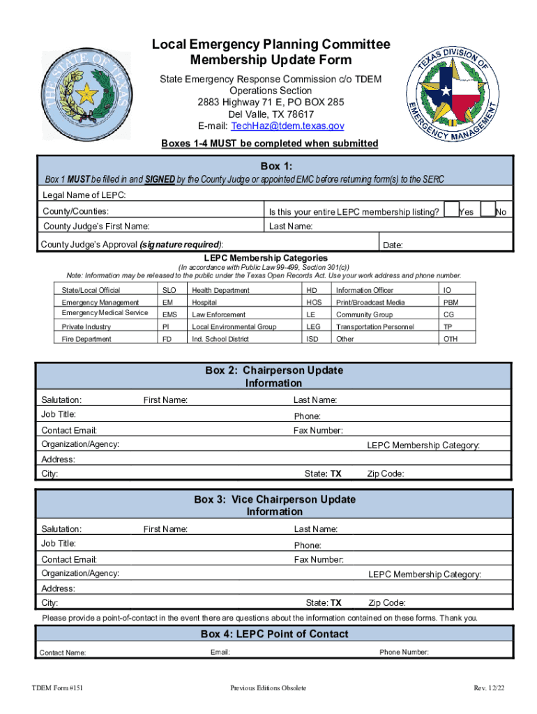Local Emergency Planning Committee Membership Update Form State Emergency Response Commission c/o THEM Operations Section 2883 Highway 71 E, PO BOX 285 Del Value, TX 78617 Email: TechHaz@tdem.texas.gov