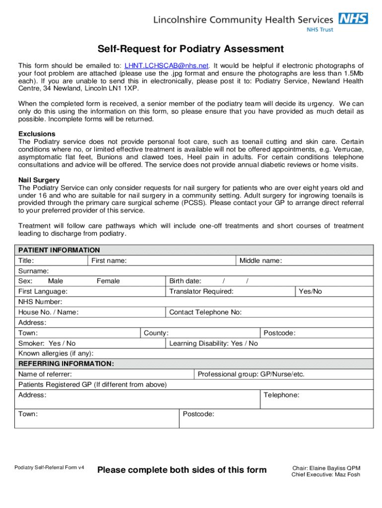 SelfRequest for Podiatry Assessment This form should be emailed to: LHNT.LCHSCAB@nhs.net. It would be helpful if electronic photographs of your foot problem are attached (please use the .jpg format