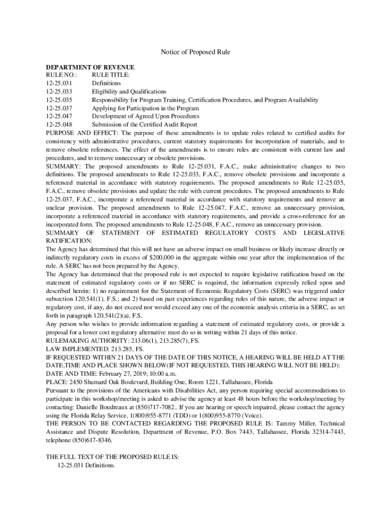 Notice of Proposed Rule DEPARTMENT OF REVENUE RULE NO.: RULE TITLE: 1225.031 Definitions 1225.033 Eligibility and Qualifications 1225.035 Responsibility for Program Training, Certification Procedures,