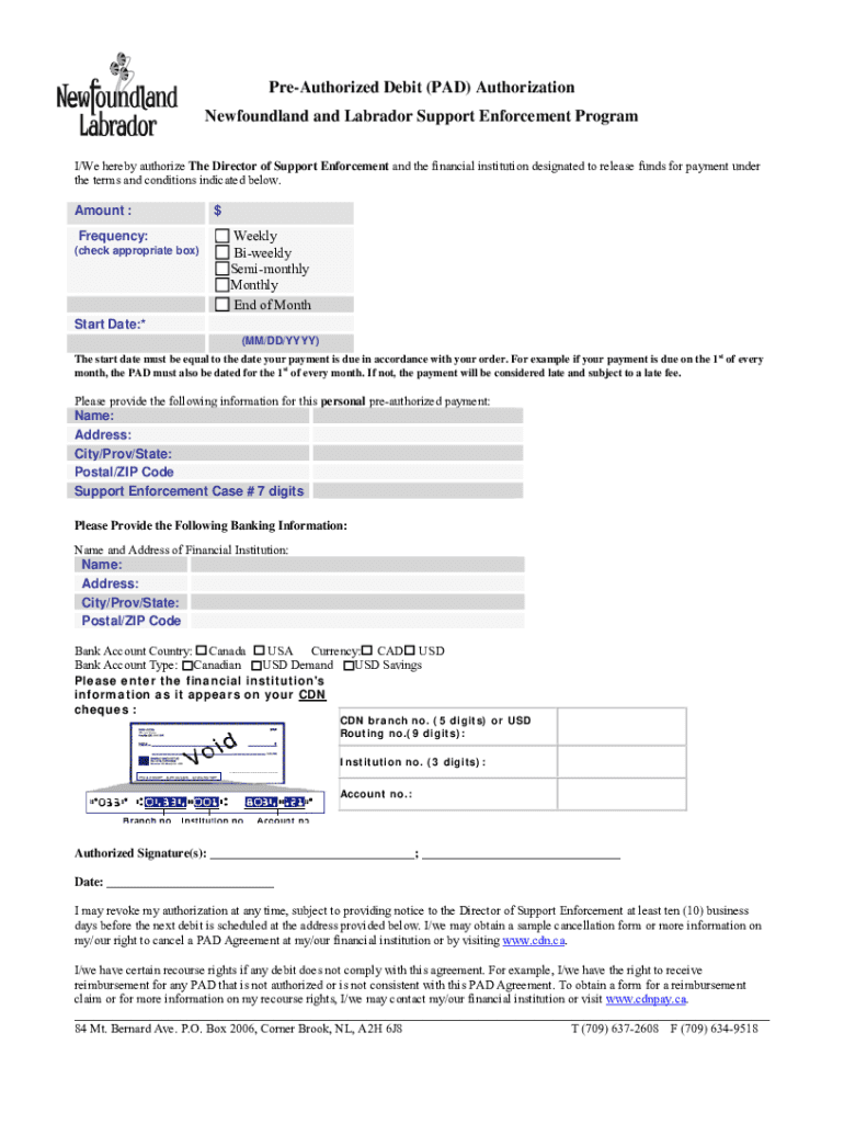 PreAuthorized Debit (PAD) Authorization Newfoundland and Labrador Support Enforcement Program I/We hereby authorize The Director of Support Enforcement and the financial institution designated to