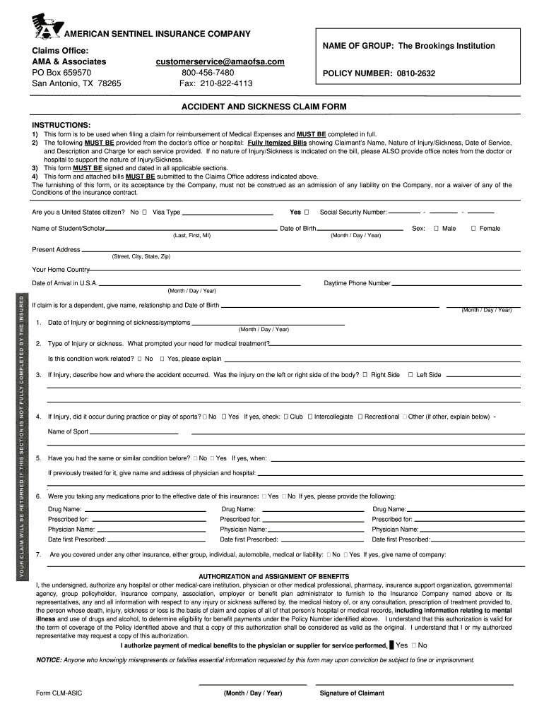 AMERICAN SENTINEL INSURANCE COMPANY NAME OF GROUP: NAME OF GROUP: The Brookings Institution Claims Office: AMA & Associates PO Box 659570 San Antonio, TX 78265 customer service amaofsa.com 800-456-7480