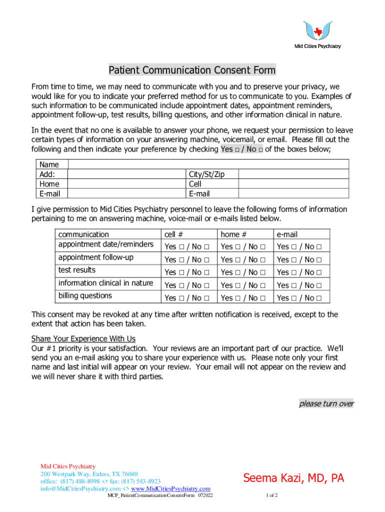 Patient Communication Consent Form From time to time, we may need to communicate with you and to preserve your privacy, we would like for you to indicate your preferred method for us to communicate