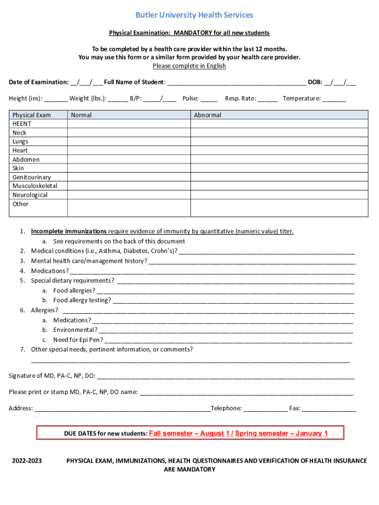 Butler University Health Services Physical Examination: MANDATORY for all new students To be completed by a health care provider within the last 12 months. You may use this form or a similar form