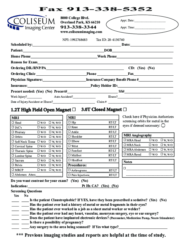 Fax 9133385352 8000 College Blvd. Overland Park, KS 66210Appt. Date:___9133383344Appt. Time:___www.coliseumimaging.comNPI: 1992768683Tax ID: 204130740 Scheduled by:___ Date:___ Patient:___DOB___ Home