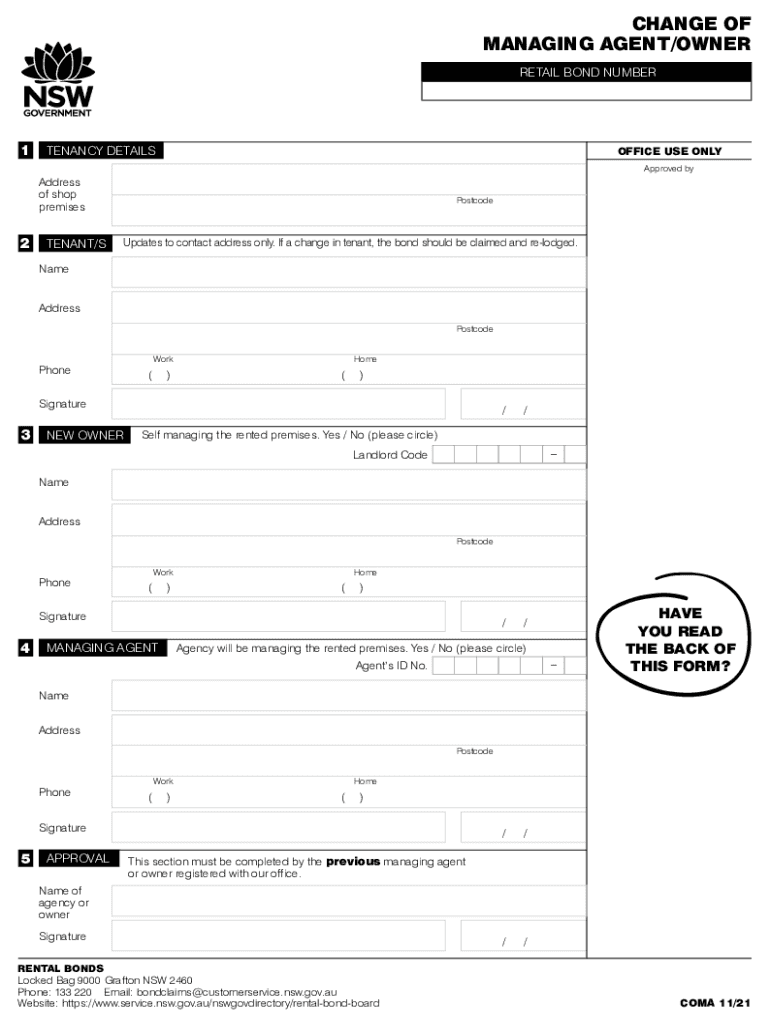 CHANGE OF MANAGING AGENT/OWNER RETAIL BOND NUMBER1TENANCY DETAILSOFFICE USE ONLY Approved address of shop premises2TENANT/SPostcodeUpdates to contact address only. If a change in tenant, the bond
