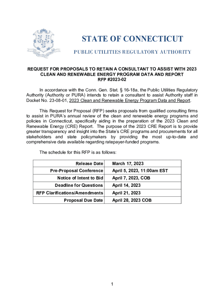 STATE OF CONNECTICUT PUBLIC UTILITIES REGULATORY AUTHORITY REQUEST FOR PROPOSALS TO RETAIN A CONSULTANT TO ASSIST WITH 2023 CLEAN AND RENEWABLE ENERGY PROGRAM DATA AND REPORT RFP #202302 In accordance