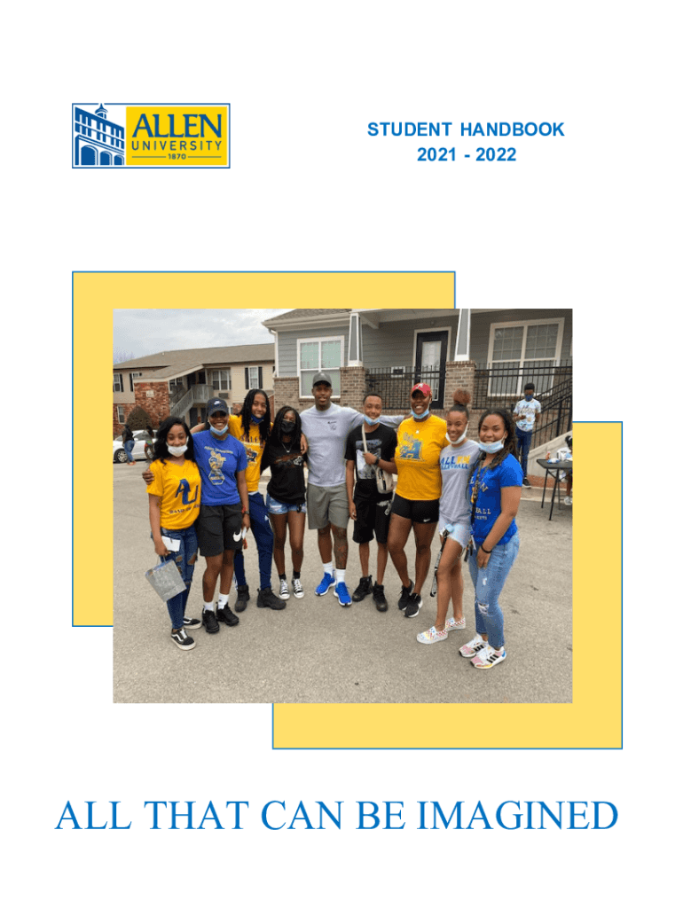 STUDENT HANDBOOK 2021 2022ALL THAT CAN BE IMAGINED Allen University 1530 Harden Street Columbia, South Carolina 29204 Phone: (803) 3765900 Fax: (803) 7992763Website: www.allenuniversity.edu Allen