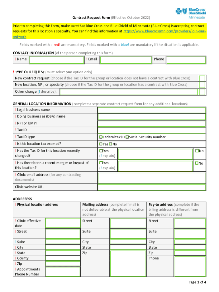 Contract Request Form (Effective October 2022) Prior to completing this form, make sure that Blue Cross and Blue Shield of Minnesota (Blue Cross) is accepting contract requests for these locations'