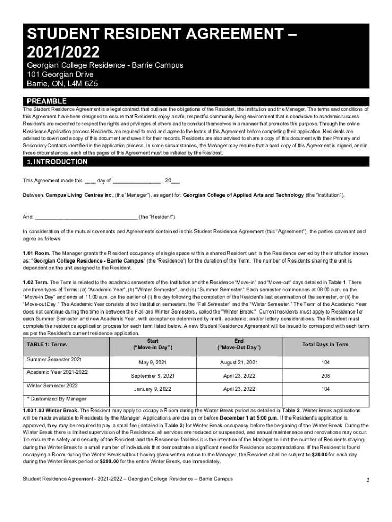 STUDENT RESIDENT AGREEMENT 2021/2022 Georgian College Residence Barrie Campus 101 Georgian Drive Barrie, ON, L4M 6Z5 PREAMBLE The Student Residence Agreement is a legal contract that outlines the