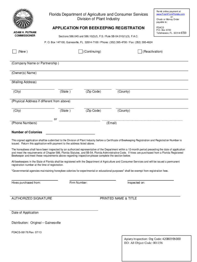 Florida Department of Agriculture and Consumer Services Division of Plant Industry APPLICATION FOR BEEKEEPING REGISTRATION ADAM H. PUTNAM COMMISSIONERRemit online payment at www.FreshFromFlorida.com