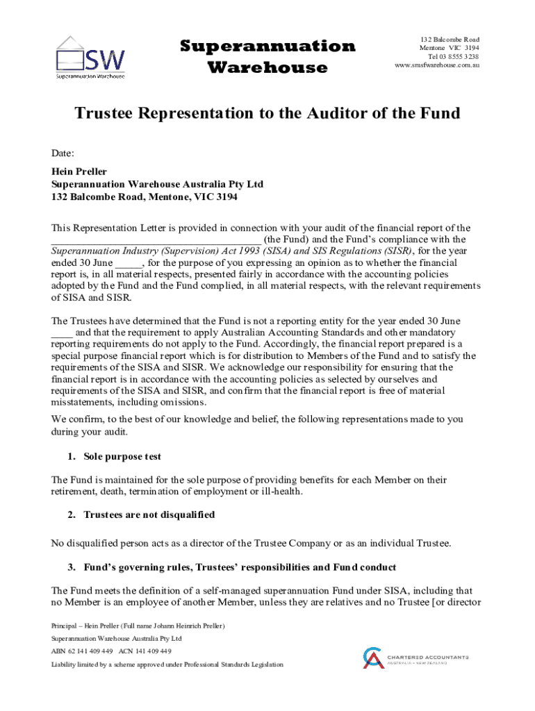 Superannuation Warehouse132 Holcombe Road Men tone VIC 3194 Tel 03 8555 3238 www.smsfwarehouse.com.auTrustee Representation to the Auditor of the Fund Date: Han Prefer Superannuation Warehouse Australia