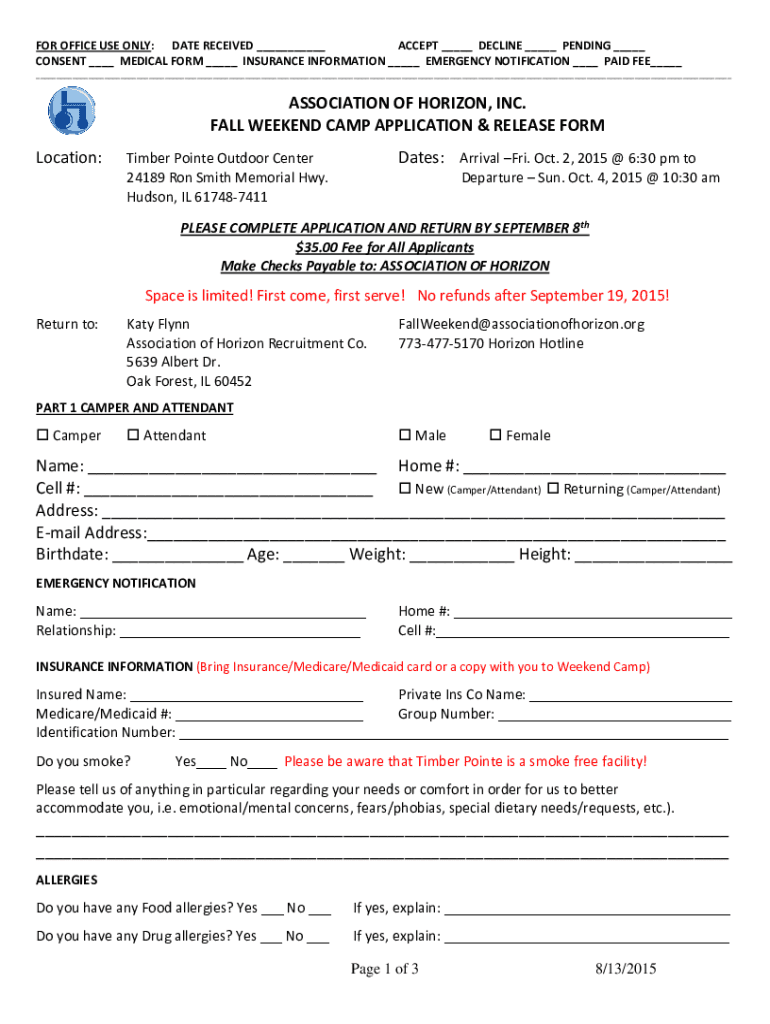FOR OFFICE USE ONLY: DATE RECEIVED ___ ACCEPT ___ DECLINE ___ PENDING ___ CONSENT ___ MEDICAL FORM ___ INSURANCE INFORMATION ___ EMERGENCY NOTIFICATION ___ PAID FEE___ ___ASSOCIATION OF HORIZON, INC.