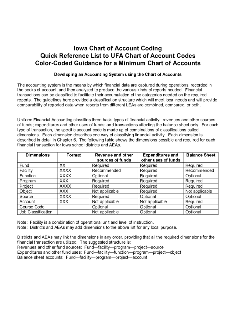 Iowa Chart of Account Coding Quick Reference List to UFA Chart of Account Codes Color-coded Guidance for a Minimum Chart of Accounts Developing an Accounting System using the Chart of Accounts The