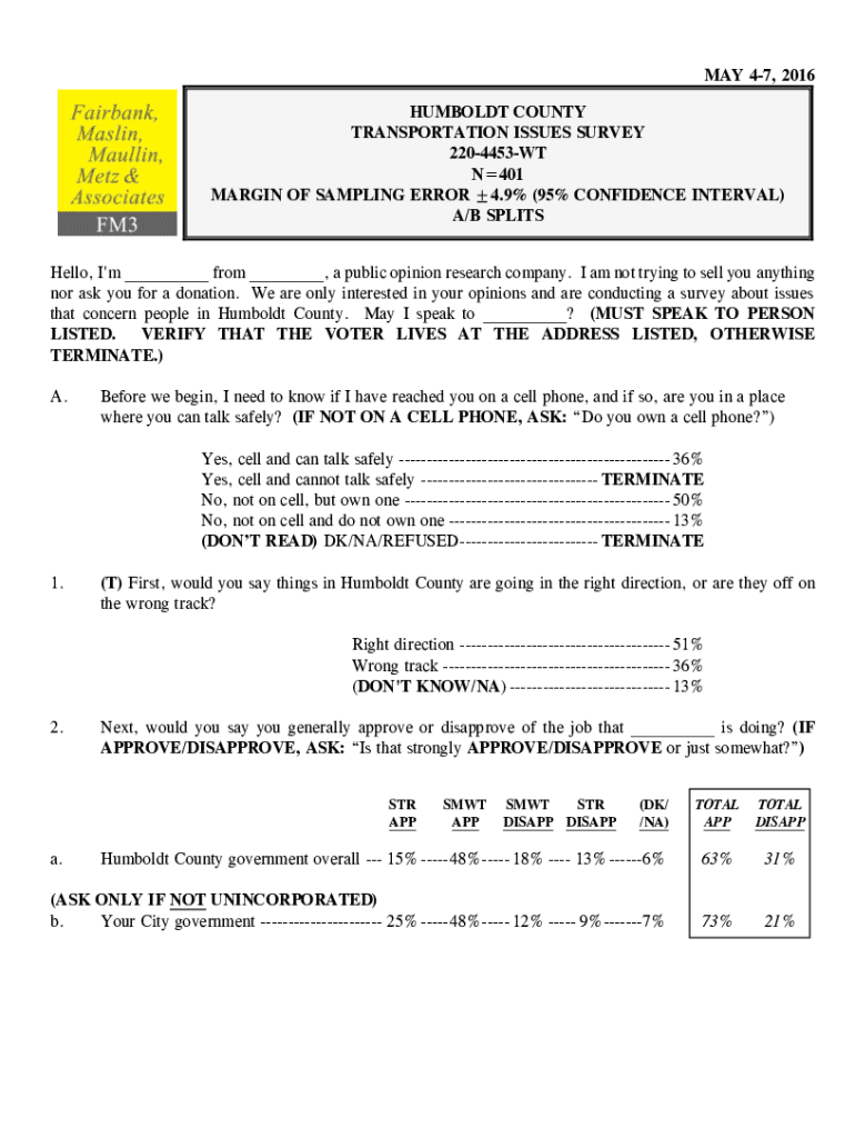 MAY 47, 2016 HUMBOLDT COUNTY TRANSPORTATION ISSUES SURVEY 2204453WT N401 MARGIN OF SAMPLING ERROR 4.9% (95% CONFIDENCE INTERVAL) A/B SPLITS Hello, I\'m ___ from ___, a public opinion research company.