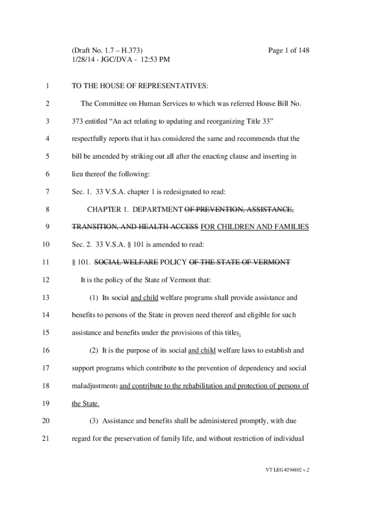 (Draft No. 1.7 H.373) 1/28/14 JC/DVA 12:53 PM1 2Page 1 of 148TO THE HOUSE OF REPRESENTATIVES: The Committee on Human Services to which was referred House Bill No.3373 entitled An act relating to updating