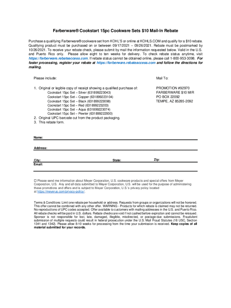 Freeware Cook start 15pc Cookware Sets $10 Mailing Rebate Purchase a qualifying Freeware cookware set from KOHL or online at KOHLS.COM and qualify for a $10 rebate. Qualifying product must be purchased