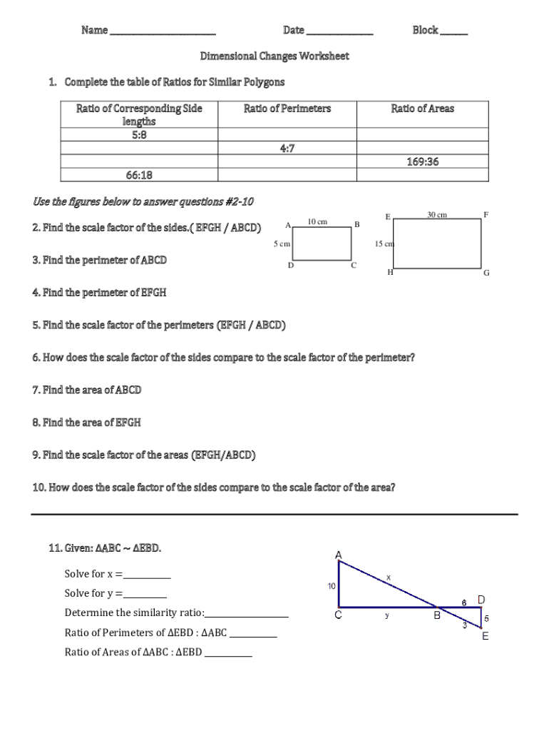 Name ___Date ___Block ___Dimensional Changes Worksheet 1. Complete the table of Ratios for Similar Polygons Ratio of Corresponding Side lengths 5:8Ratio of PerimetersRatio of Areas4:7 169:36 66:18Use