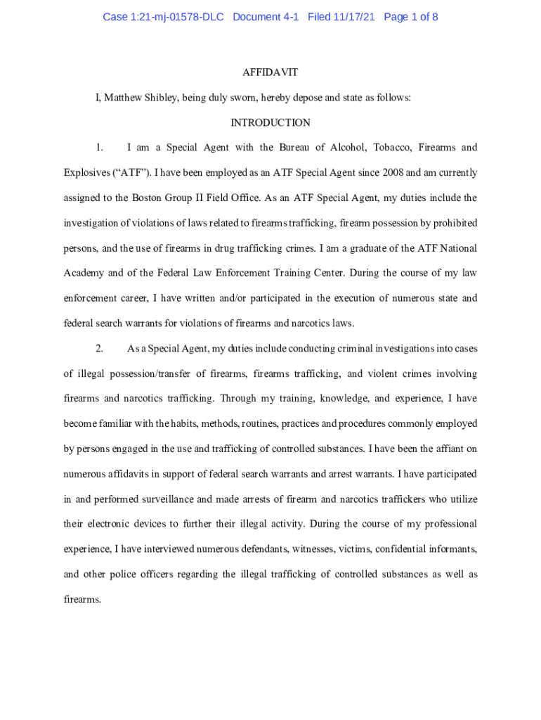 Case 1:21mj01578DLC Document 41 Filed 11/17/21-Page 1 of 8AFFIDAVIT I, Matthew Shirley, being duly sworn, hereby depose and state as follows: INTRODUCTION 1. I am a Special Agent with the Bureau of