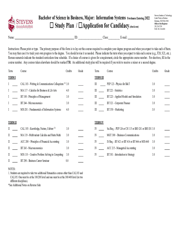 Bachelor of Science in Business, Major: Information SystemsFreshmen Entering 2022 Study Plan / Application for Candidacy (check one)Name:Stevens Institute of Technology Castle Point on Hudson Hoboken,