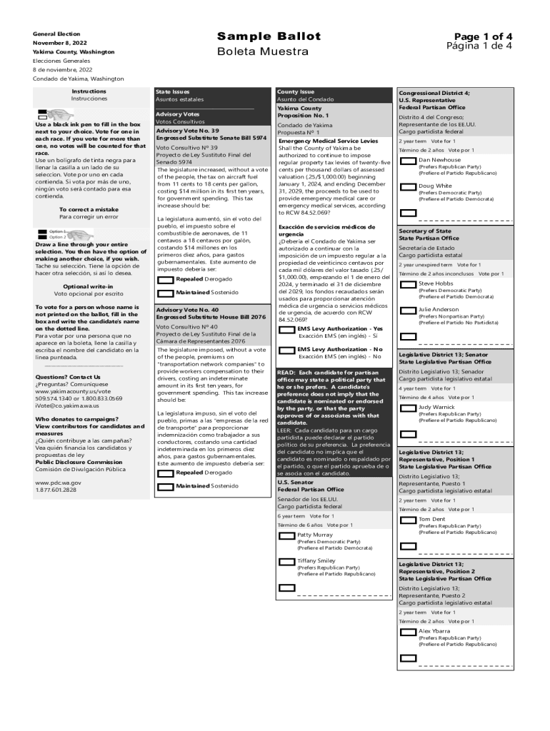 General Election November 8, 2022Yakima County, Washington Elections GeneralesPage 1 of 4 Gina 1 de 4Sample Ballot Bole ta Muestra8 de November 2022 Condado de Yakima, Washington Instructions InstruccionesUse
