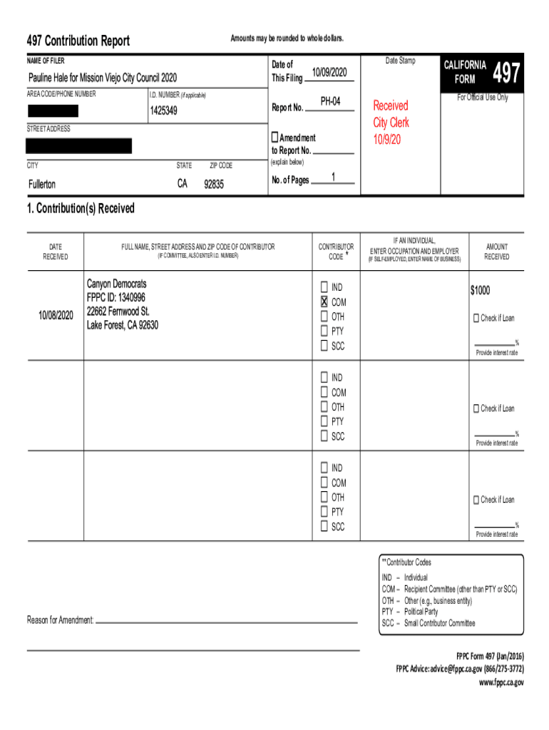 497 Contribution ReportAmounts may be rounded to whole dollars.NAME OF Filtrate Stimulate of This Filigree CODE/PHONE NUMBER. D. NUMBER (if applicable)Received City Clerk 10/9/20Report No. STREET