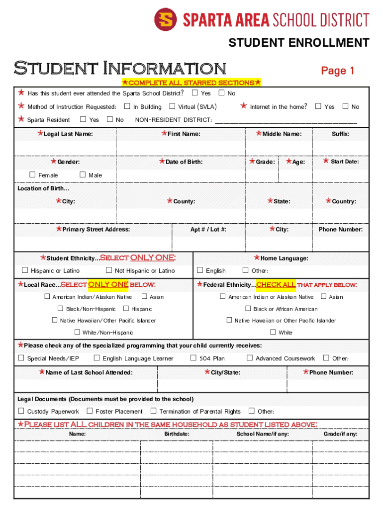STUDENT ENROLLMENTStudent Information Page 1complete all starred sections Has this student ever attended the Sparta School District? Yes No Method of Instruction Requested: In Building Virtual (SLA)