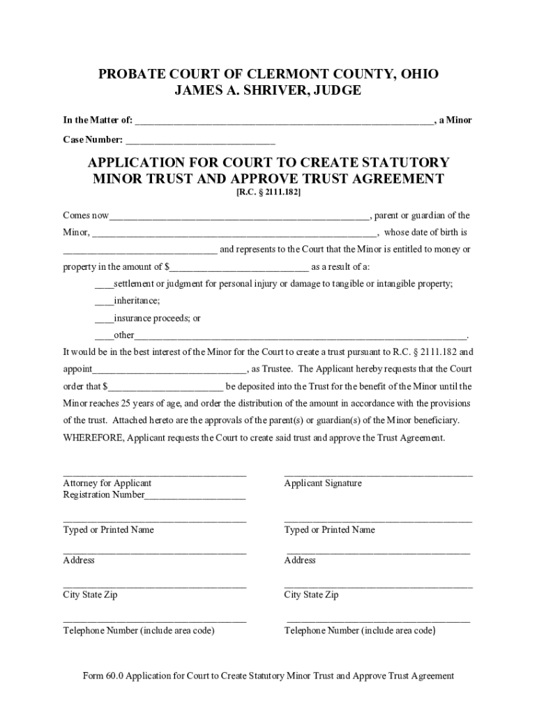 PROBATE COURT OF CLERMONT COUNTY, OHIO JAMES A. SHIVER, JUDGE In the Matter of: ___, a Minor Case Number: ___APPLICATION FOR COURT TO CREATE STATUTORY MINOR TRUST AND APPROVE TRUST AGREEMENT [R.C.